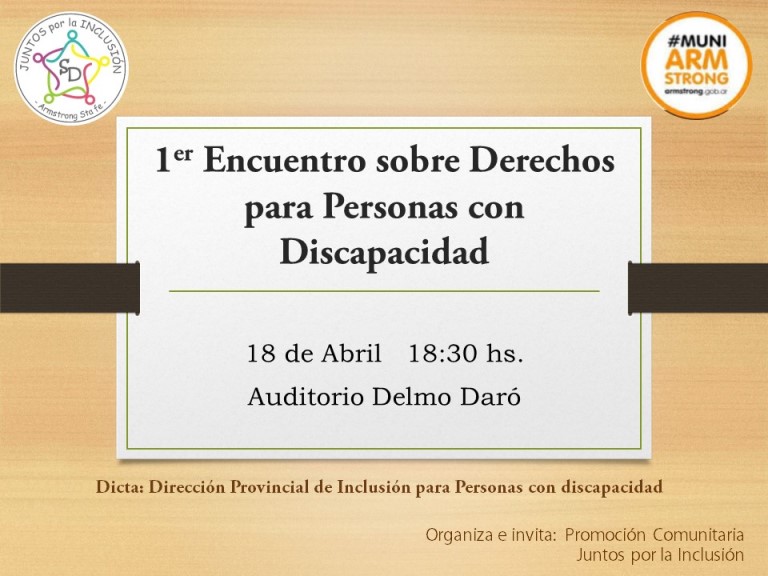 La Municipalidad de Armstrong a través de la Dirección de Promoción Comunitaria y el grupo “Juntos por la Inclusión” invitan al 1° encuentro sobre Derechos de las Personas con Discapacidad que se realizará el miércoles 18 de abril a las 18:30 hs. en el auditorio Delmo Daró.