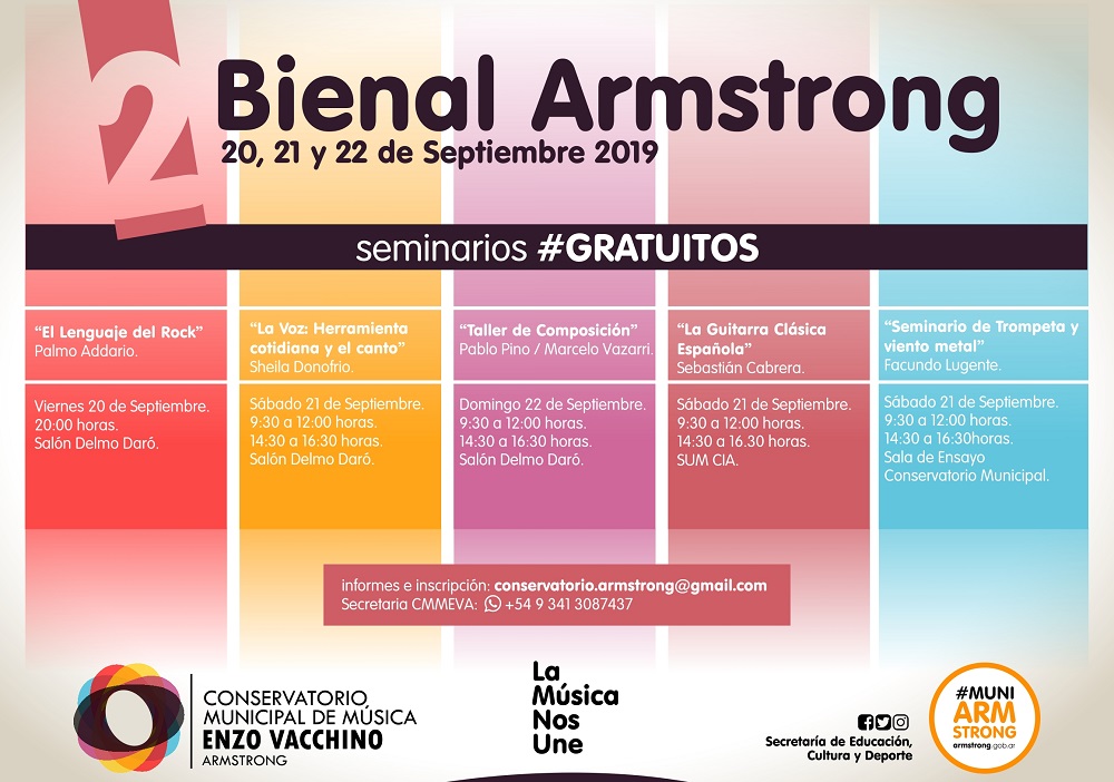 La Municipalidad de Armstrong a través del Conservatorio Municipal de Música “Enzo Vacchino” presenta la 2° Bienal de Música que se ofrecerá los días 20, 21 y 22 de septiembre de 2019 con una importante grilla de seminarios gratuitos, dictados por prestigiosos músicos.