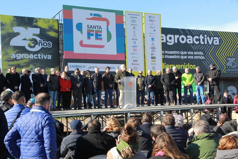 AgroActiva inaugurò oficialmente su vigésimo quinta edición en la localidad santafesina de Armstrong con el saludo del presidente Mauricio Macri que, a través de un video, envió palabras de aliento para los productores, los empresarios y los organizadores de la mega muestra. En primer lugar los alumnos de la banda musical del municipio local entonaron las estrofas del himno nacional, luego fue el momento de los discursos que, en un año electoral tuvieron varias frases destacadas que los asistentes, contados de a miles, escucharon atentamente.