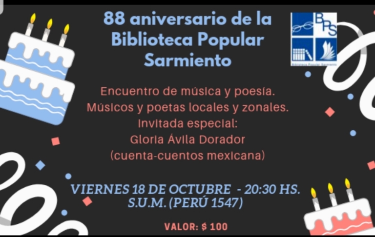 La Biblioteca Popular Sarmiento invita a celebrar su 88° Aniversario,el próximo viernes 18 de octubre, a las20,30hs. Habrá música y poesía con invitados locales y de la región.