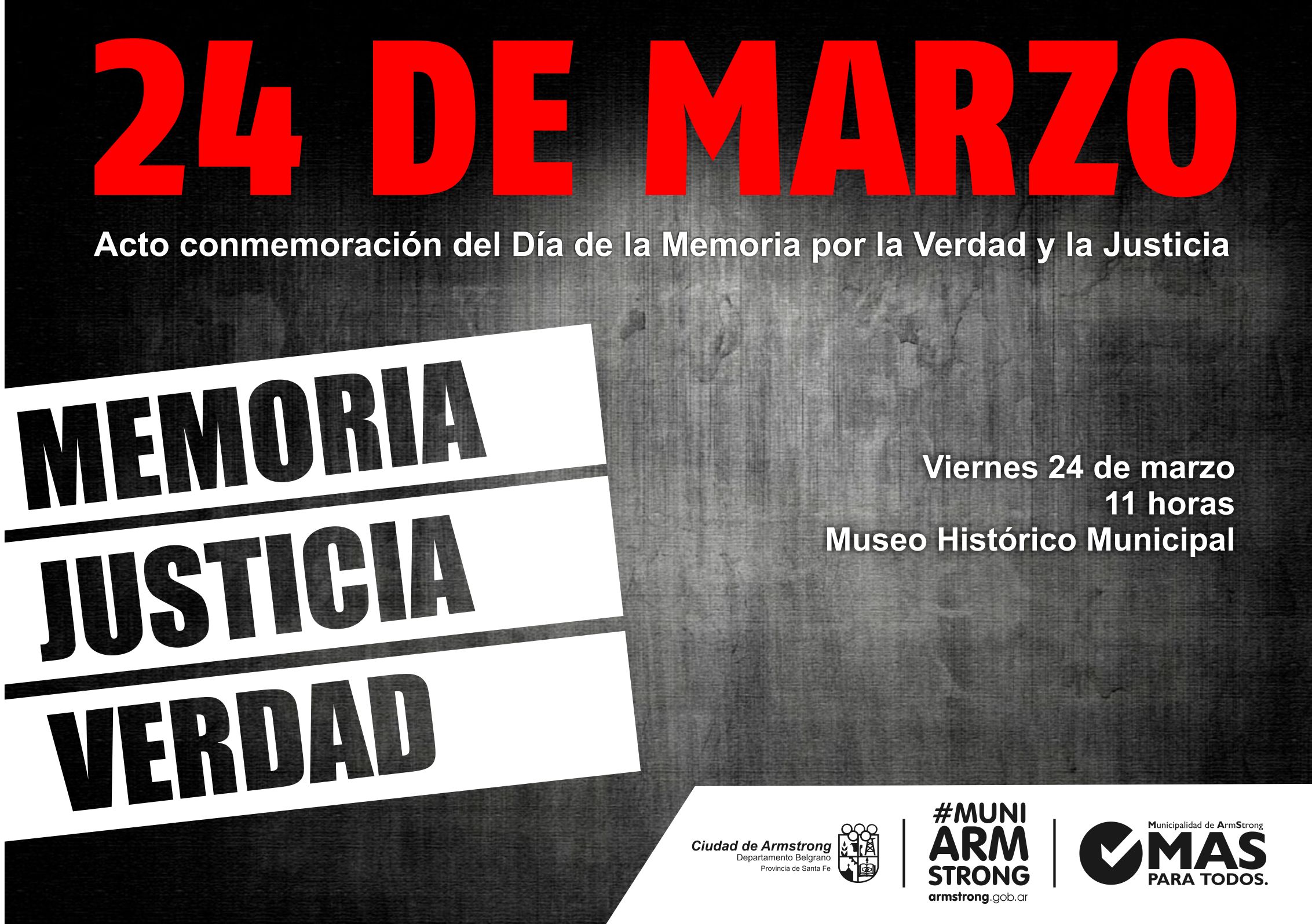 La Municipalidad de Armstrong invita a toda la ciudadanía a participar del acto en el Día de la Memoria por la Verdad y la Justicia que se realizará el día viernes 24 de marzo a las 11 hs. en Museo Histórico.