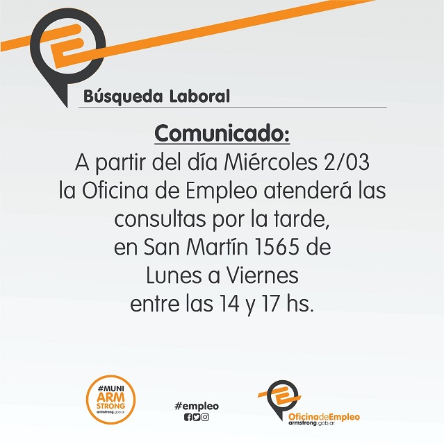 La Municipalidad de Armstrong informa que el horario de atención de la Oficina de Empleo es de lunes a viernes de 14 a 17 hs., debido a la importante demanda de la ciudadanía.