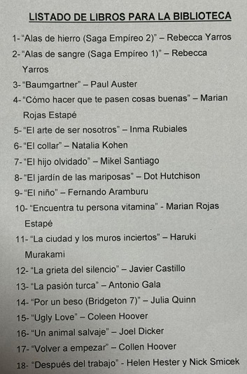 “Solicitamos a la comunidad que colabore con lo que pueda, sabemos que nuestra biblioteca es un espacio de encuentro y entre todos podemos poner un granito de arena para que estos 18 libros de diferentes autores, completen los estantes y permitan seguir ofreciendo una amplia variedad de lecturas”. Expresó la concejal.