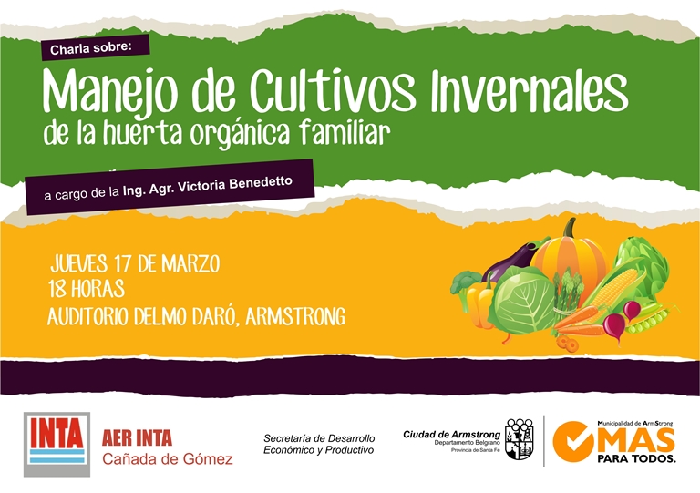 La Municipalidad de Armstrong, a través de la Secretaría de Desarrollo Económico y Productivo, invita a la charla sobre el manejo de cultivos invernales de la huerta orgánica familiar que se realizará el jueves 17 de marzo a las 18 hs. en el salón Delmo Daró.