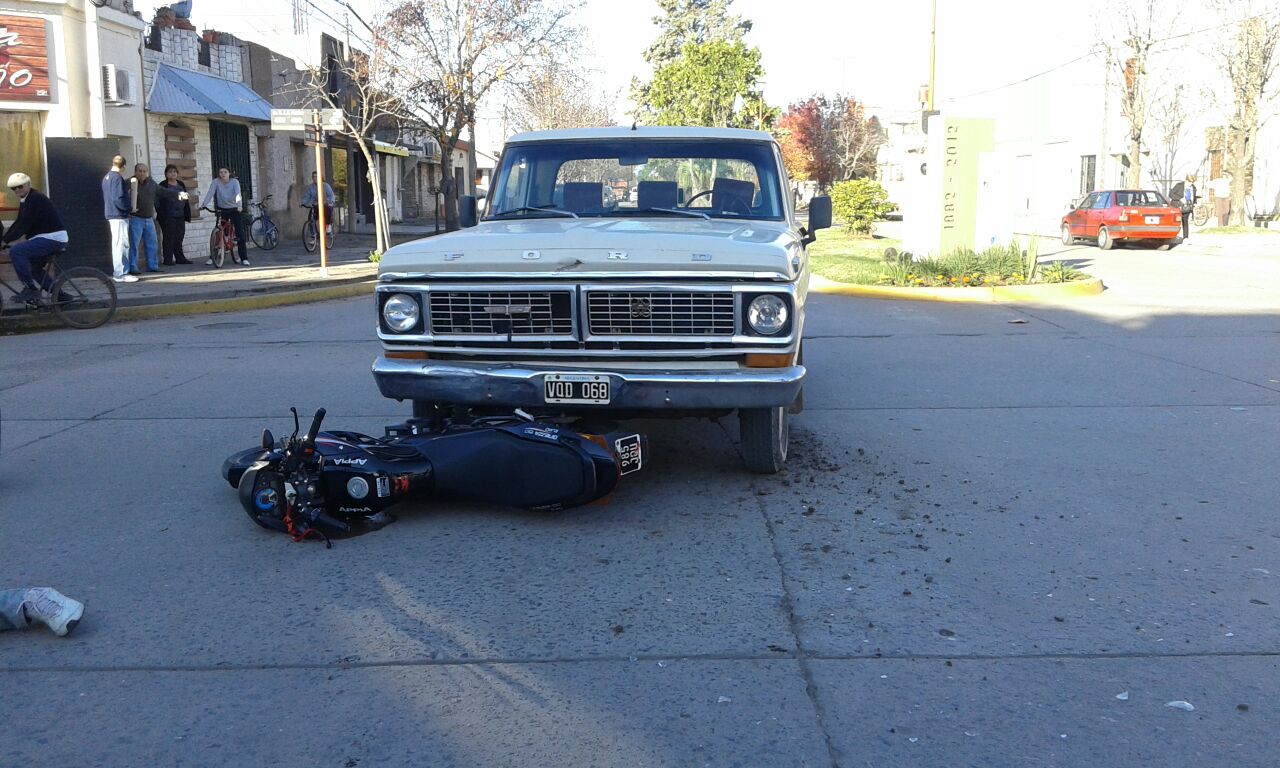 En la tarde del jueves, a la hora 16,30 se produce un accidente entre una camioneta Ford F 100, color blanco, que circulaba de E a Oeste por el boulevard, conducida por Rodolfo A. Fariñas de 75 años, y una motocicleta marca Apia, 150cc, que circulaba de S. a Norte, conducida por Héctor H. Jossen, de 40 años. Que resulta con lesiones graves, fractura expuesta de tibia y peroné, derivado a la ciudad de Rosario.