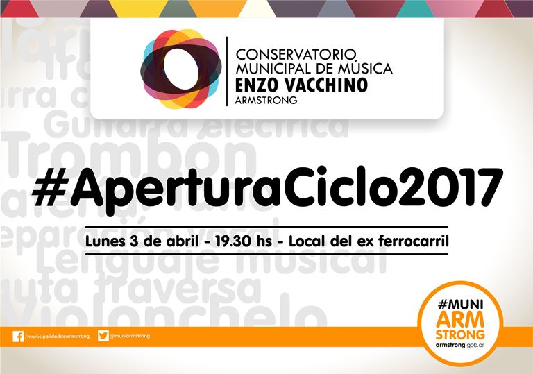 La Municipalidad de Armstrong invita al acto de apertura del ciclo 2017 del Conservatorio Municipal de Música “Enzo Vacchino” que se realizará el lunes 3 de abril a las 19:30 hs. en el local del ex ferrocarril.