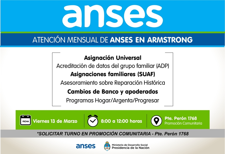 La Administración Nacional de la Seguridad Social (ANSES) y la Municipalidad de Armstrong informan que en el marco de su programa de atención a la comunidad, el día viernes 13 de marzo, de 8 a 12 hs. atenderá a los vecinos de nuestra ciudad, en la oficina de Promoción Comunitaria, Pte. Perón 1768.