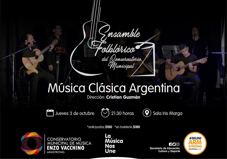 La Municipalidad de Armstrong a través del Conservatorio de Música “Enzo Vacchino” invita al concierto de Música Clásica Argentina que brindará el Ensamble Folclórico el día jueves 3 de octubre a las 21:30 hs. en la Sala Iris Marga, en calle Dr. Fischer 860 de nuestra ciudad.