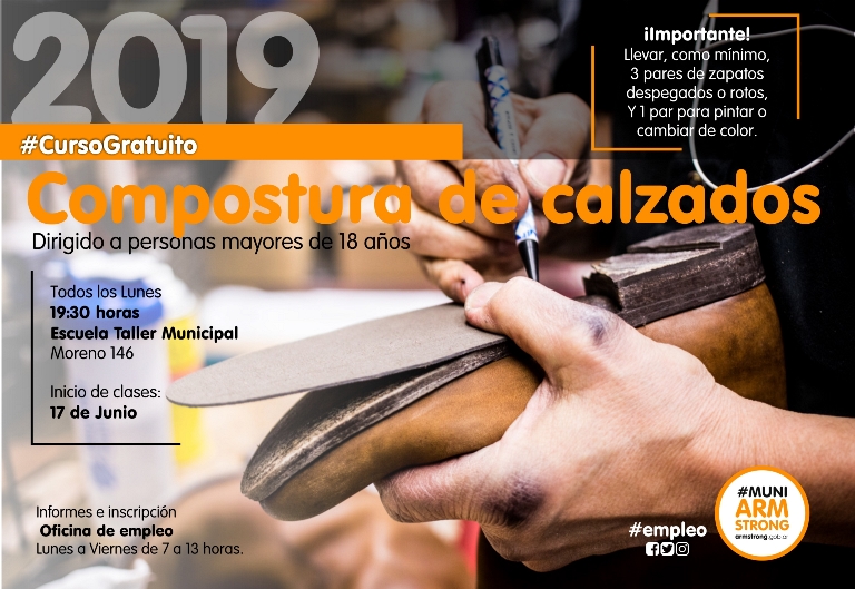 La Municipalidad de Armstrong invita al curso de compostura de calzados que se dictará de manera gratuita a partir del lunes 17 de junio en la Escuela Taller, ubicada en calle Moreno 146.