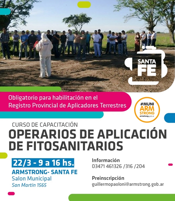 La Municipalidad de Armstrong conjuntamente con el Ministerio de Producción de la Provincia de Santa Fe invita al curso de capacitación para operarios de aplicación de fitosanitarios que se ofrecerá el viernes 22 de marzo, de 9 a 16 hs. en el salón Delmo Daró, San Martín 1565.