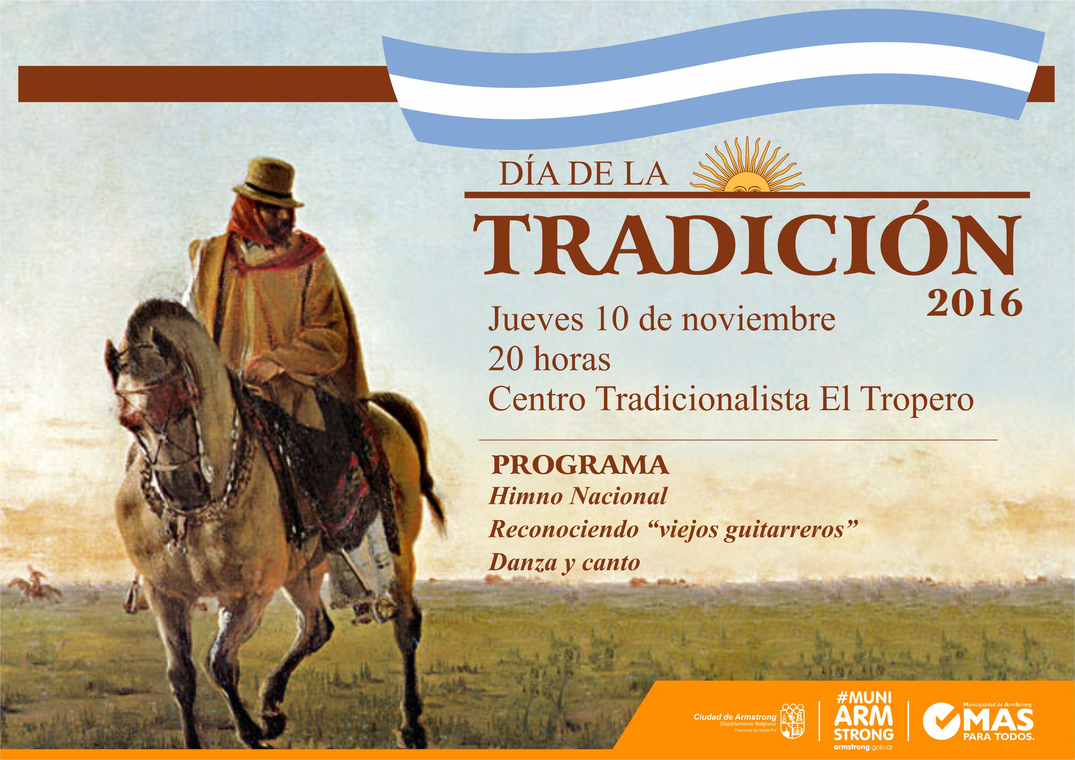 tradicion-2016La Municipalidad de Armstrong junto a “El Tropero” invita a participar de los festejos del Día de la Tradición que se realizarán el jueves 10 de noviembre a partir de las 20 hs. en las instalaciones del centro tradicionalista.