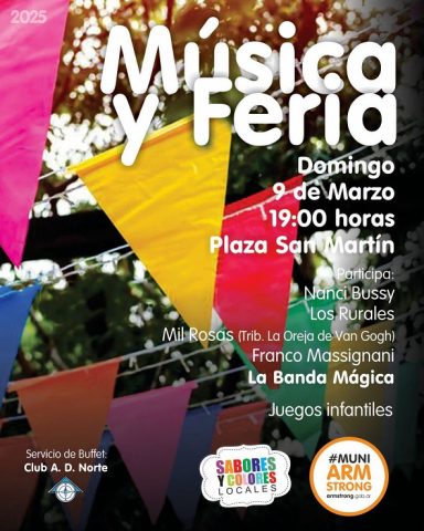 La Municipalidad de Armstrong invita a compartir un atardecer con mucha música en vivo que se realizará el domingo 9 de marzo a partir de las 19 hs. en plaza San Martín.