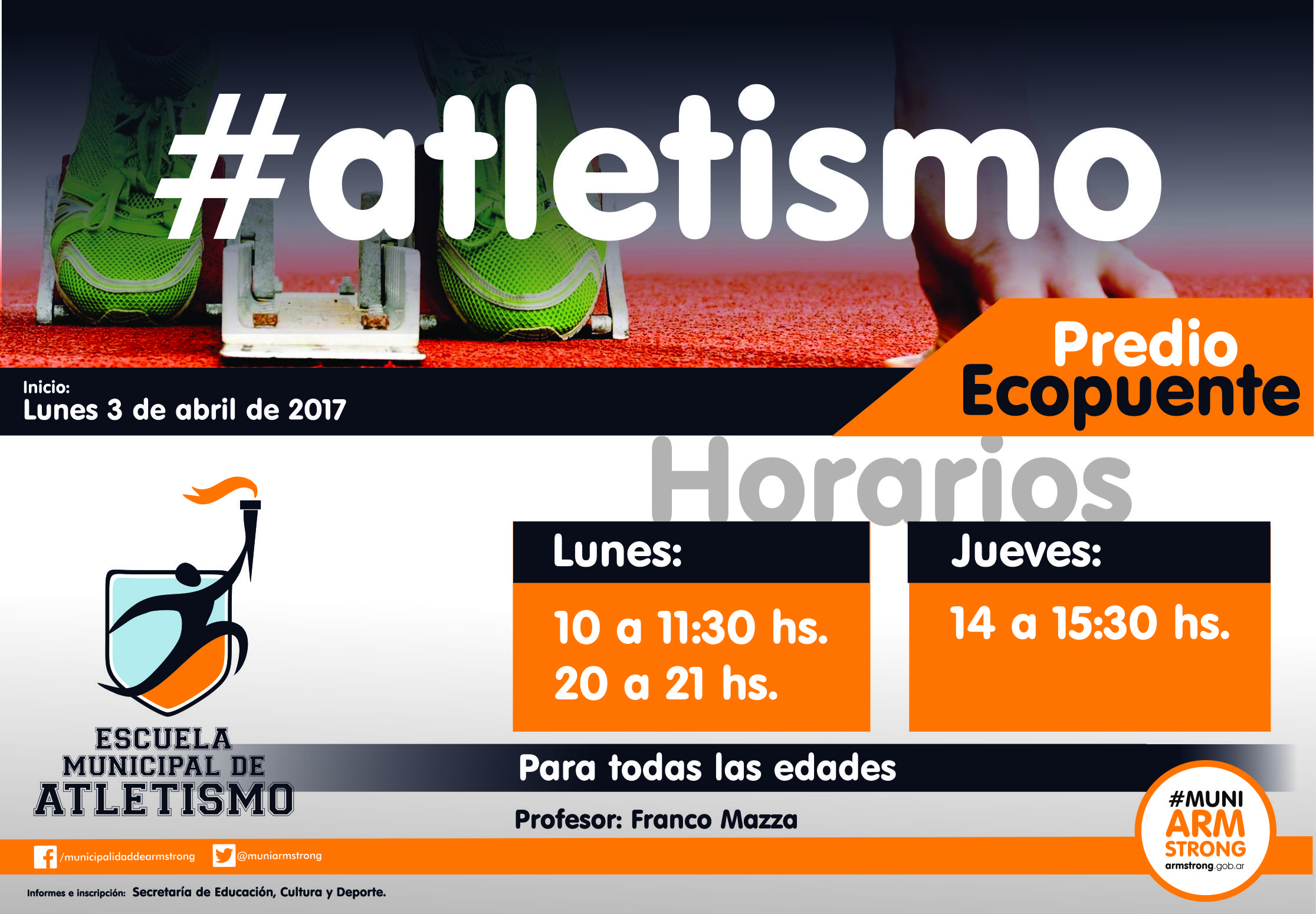 La Municipalidad de Armstrong invita a formar parte de la Escuela Municipal de Atletismo que desarrollará sus clases en el predio del Ecopuente a partir del lunes 3 de abril y estará a cargo del Profesor Franco Mazza.
