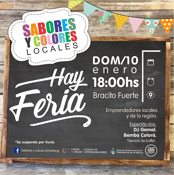 La Municipalidad de Armstrong invita a participar de la primera feria del año de Sabores y Colores Locales, el domingo 10 de enero a partir de las 18 hs. en el parque recreativo Bracito Fuerte.