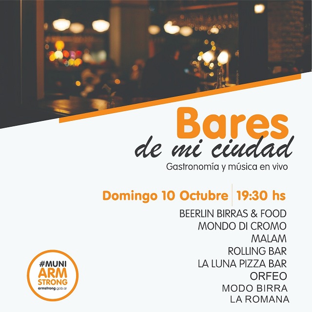 Luego del éxito de las ediciones anteriores, la Municipalidad de Armstrong invita a una nueva jornada de “Bares de mi Ciudad” que se realizará el domingo 10 de octubre desde las 19:30 hs. con la excelente predisposición de quienes participan, ofreciendo al público diferentes propuestas.