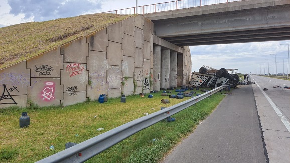Por causas que se tratan de establecer un camión cargado con garrafas pierde el control choca contra guardarail luego vuelca. Al llegar al lugar nos encontramos con un masculino fuera del habitáculo que fue trasladado rápidamente al Samco local y otra persona dentro del habitáculo lamentablemente fallecida.