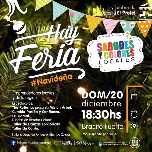 La Municipalidad de Armstrong invita a participar de la Feria Navideña de Sabores y Colores Locales que se realizará este domingo 20 de diciembre desde las 18:30 hs. en el parque recreativo Bracito Fuerte.