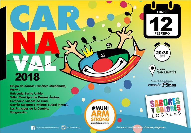 La Municipalidad de Armstrong invita a participar del festejo de carnaval que se realizará el lunes 12 de febrero en plaza San Martín desde las 20:30 hs. y, en caso de lluvia se trasladará a la Estación Más.