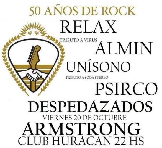El día viernes 20 de octubre en el Club Huracán de Armstrong (Delfo Cabrera y Barrios). Desde las 22hs se va a celebrar los 50 años de Rock en Argentina, va a contar con la presencia de bandas de calidad de la zona y locales, Relax (tributo a Virus), Unísono (Tributo a Soda Stereo), Psirco, Almin y el cierre a cargo de Despedazados (Tributo a la Renga).