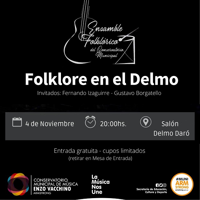 La Municipalidad de Armstrong invita a participar de un nuevo encuentro con la música a través del ciclo “Folclore en el Delmo” que se realizará el jueves 4 de noviembre a las 20 hs. en el salón auditorio Delmo Daró.