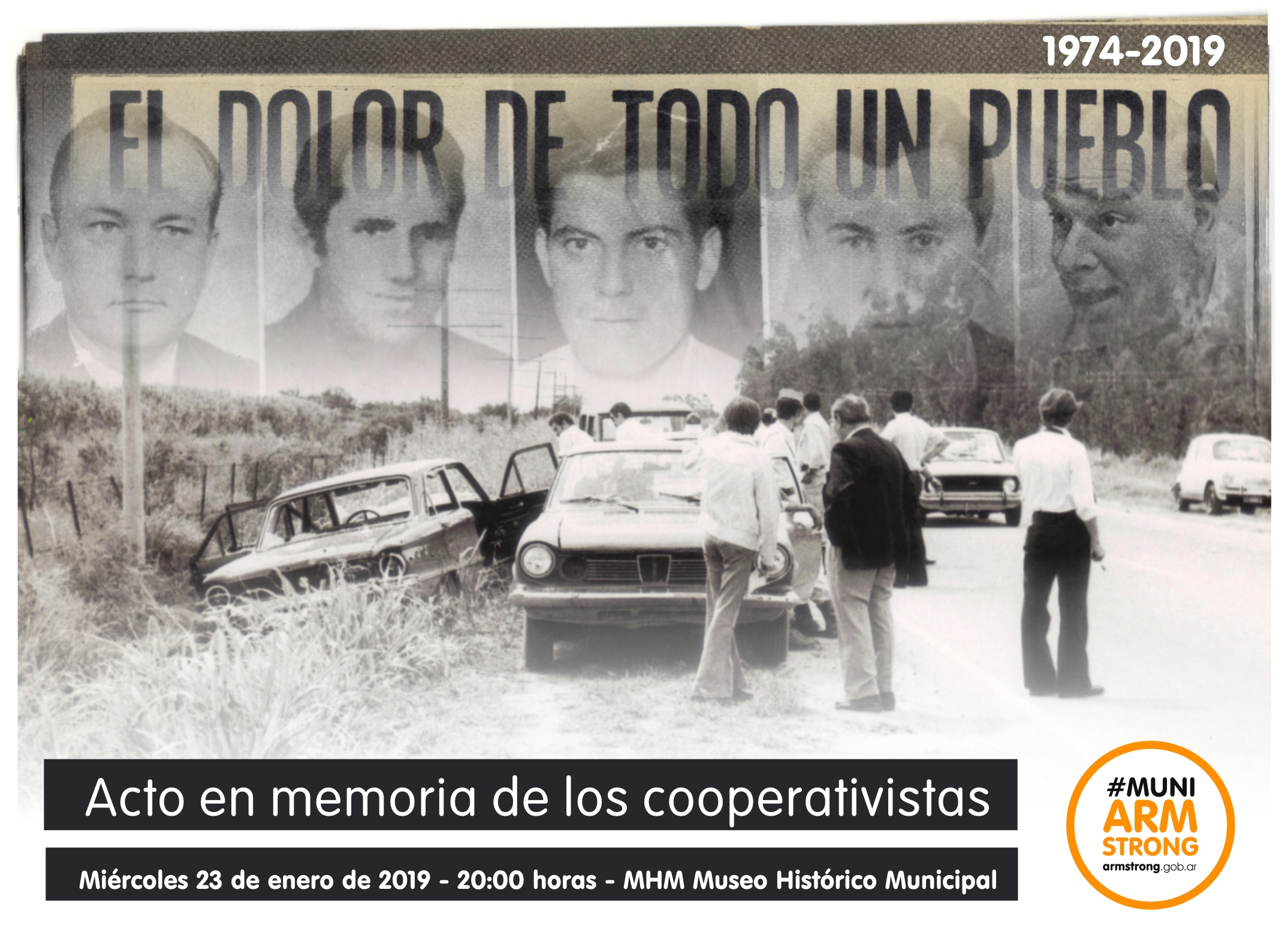 La Municipalidad de Armstrong a través de la Secretaría de Educación, Cultura y Deporte invita a participar del acto homenaje que se realizará el miércoles 23 de enero a las 20 hs. en el Museo Histórico Municipal al conmemorarse el 45° aniversario del asesinato de los cooperativistas.