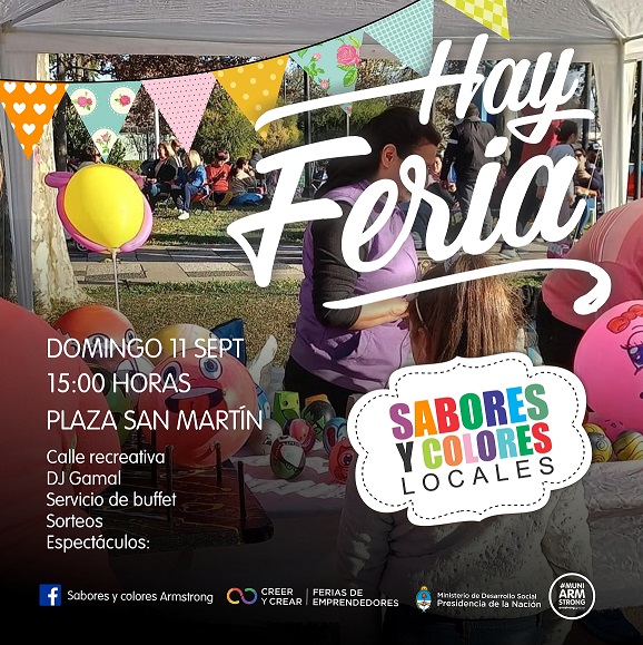 La Municipalidad de Armstrong invita a participar de la Feria Sabores y Colores Locales que se realizará este domingo 14 de agosto a partir de las 15 hs. en Plaza San Martín.