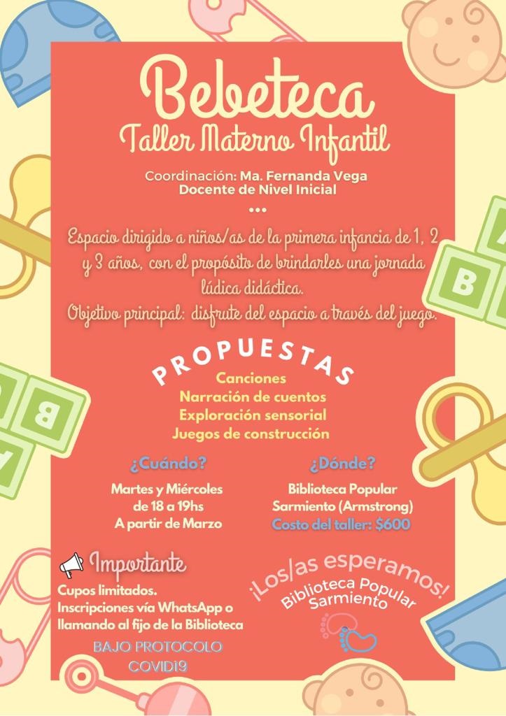En el mes de marzo, se realizara el taller materno infantil «Bebeteca», destinado a niños de la primera infancia, 1, 2 y 3 años con el propósito de brindarles una jornada lúdico- didáctica, el objetivo principal es el disfrute del espacio a través del juego. Se realizará los días martes y miércoles de 18 a 19hs en la Biblioteca Popular Sarmiento.