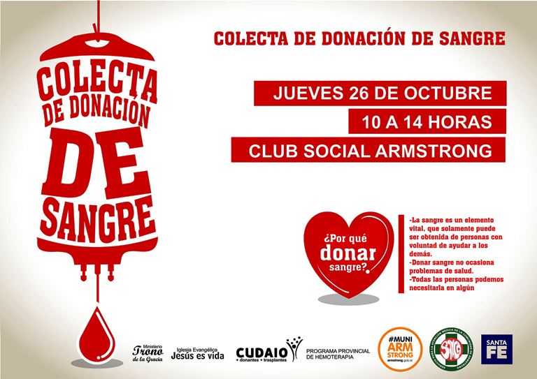 La Municipalidad de Armstrong invita a participar a la Jornada “Colecta de Donaciones de Sangre” que se realizará el día jueves 26 de octubre a partir de las 10 a 14 hs en el Club Social de Armstrong.