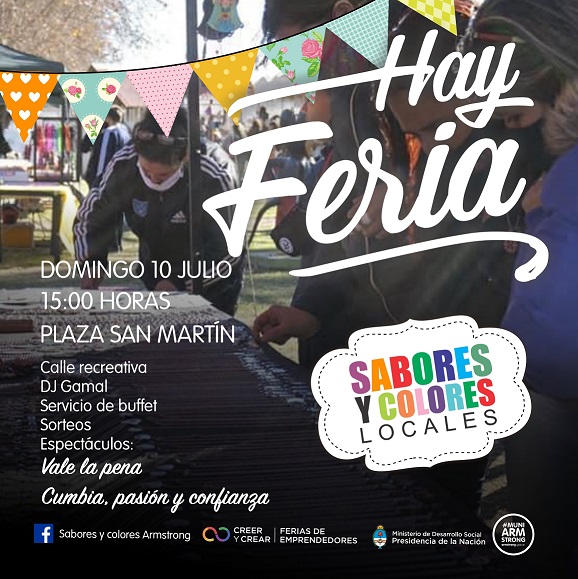 Este domingo 10 de julio habrá una nueva edición de la Feria Sabores y Colores Locales que propone la Municipalidad de Armstrong. Será en Plaza San Martín a partir de las 15 hs. donde emprendedores de nuestra ciudad y la región estarán ofreciendo su gran variedad de productos elaborados artesanalmente.