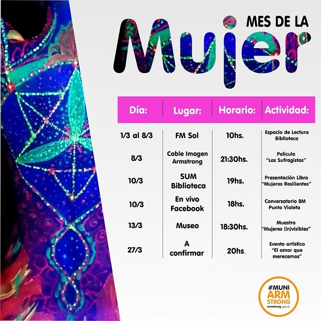 La Municipalidad de Armstrong invita a participar de las actividades previstas con motivo del Día de la Mujer, el cual se conmemora cada 8 de marzo por la lucha de las mujeres por su participación en la sociedad y su desarrollo íntegro como persona, en pie de igualdad con el hombre.