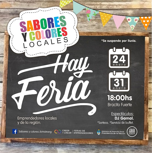 La Municipalidad de Armstrong invita a participar de una nueva jornada de la Feria Sabores y Colores Locales que se realizará este domingo 24 y luego el 31 de enero desde las 18 hs. en el parque recreativo Bracito Fuerte.