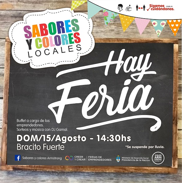 La Municipalidad de Armstrong invita a participar de una nueva jornada de la Feria Sabores y Colores Locales que se realizará este domingo 15 de agosto desde las 14:30 hs. en el parque recreativo Bracito Fuerte.
