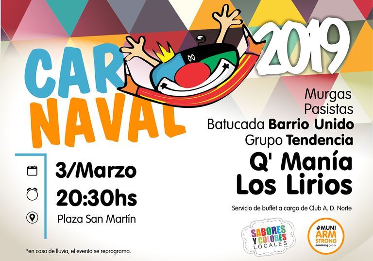 La Municipalidad de Armstrong a través de la Secretaría de Educación, Cultura y Deporte invita al festejo de la gran noche de carnaval que se realizará el domingo 3 de marzo desde las 20:30 hs. en plaza San Martín.