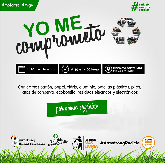 La Municipalidad de Armstrong invita a participar de una nueva jornada de canje en el marco del programa “Yo me Comprometo”que se realizará el próximo martes 20 de julio de 9,30 a 14 hs. en la plazoleta Santa Rita, ubicada en calles San Martín y Tomás Dean.