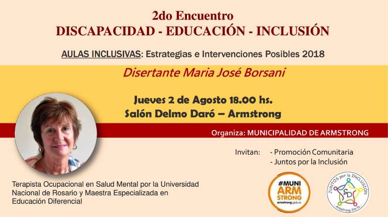 discapacidadLa Municipalidad de Armstrong desde la Dirección de Promoción Comunitaria junto al grupo Juntos por la Inclusión invita al 2° encuentro sobre discapacidad, educación e inclusión que se realizará el día jueves 2 de agosto a las 18 hs. en el salón Delmo Daró.
