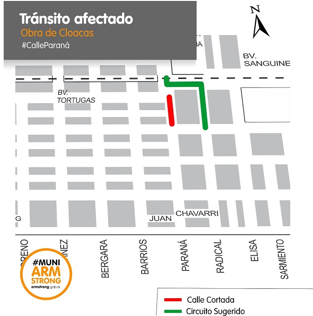 «La Municipalidad de Armstrong informa que el tránsito se encuentra interrumpido en calle Paraná entre Tortugas y Delfo Cabrera, por obra de cloacas. Se solicita evitar transitar por dicha zona. Disculpas por las molestias ocasionadas.