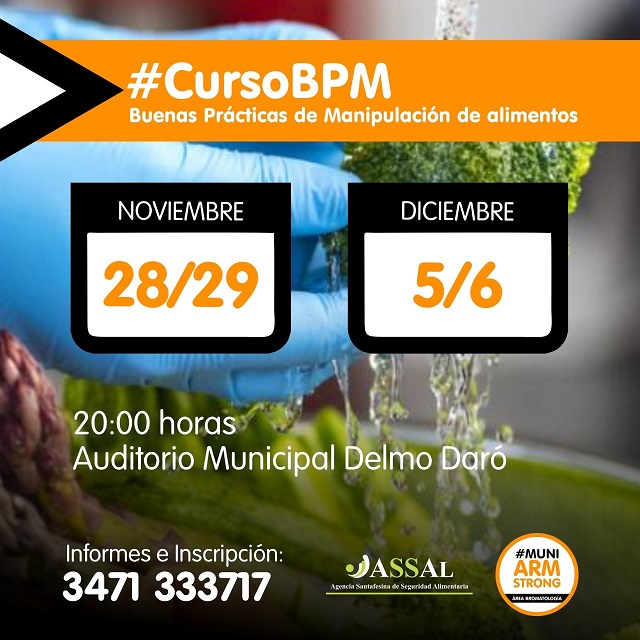 La Municipalidad de Armstrong informa que los días 28 y 29 de noviembre y 5 y 6 de diciembre a las 20 hs. en el auditorio Delmo Daró se ofrecerá el último curso del año 2022 sobre buenas prácticas de manipulación de alimentos.