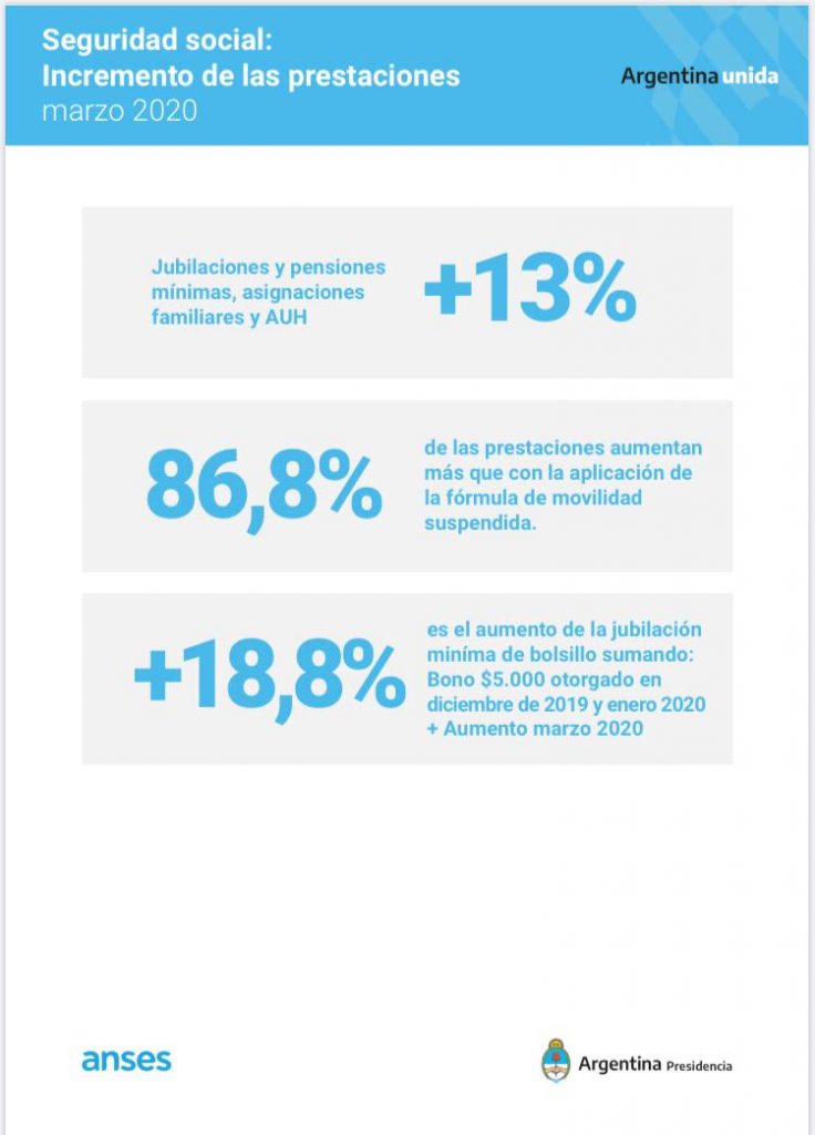 El aumento será de $1.500, que quedará incorporado en el haber, más un extra de un 2,3% para todo el universo de jubilaciones y pensiones. De esta forma se logra un aumento más distributivo y solidario. El objetivo es favorecer a los sectores más vulnerables de la sociedad. De esta manera quienes hoy perciben la mínima lograran un incremento equivalente al 13%. Esto es un porcentaje superior al que hubieran recibido con la fórmula de movilidad suspendida (11,56%) y también a la inflación proyectada para el primer trimestre (alrededor del 8%).
