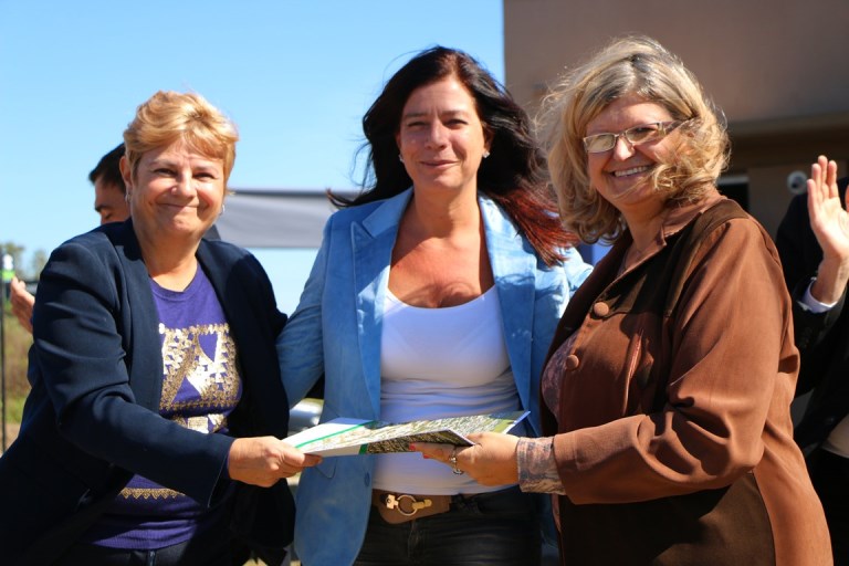 La intendenta Stella Clérici junto a autoridades provinciales encabezadas por la ministra de Educación Claudia Balagué y el secretario de Hábitat Diego Leone y dirigentes de Amsafe, entregaron las llaves a los adjudicatarios de los 40 viviendas dl barrio “Fanny Giordano”.