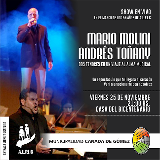 21.00 Hs Mario Molini y Andres Toñany presentan “Dos Tenores En Un Viaje Al Alma Musical”, en Casa Del Bicentenario.