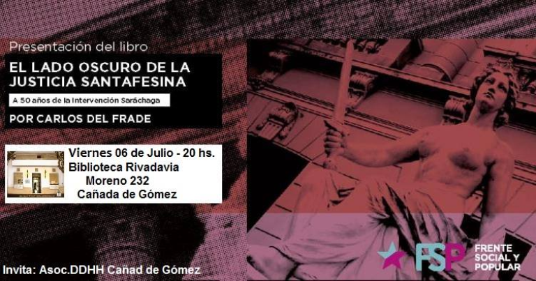 El Diputado Provincial Carlos del Frade presenta su última investigación “El lado oscuro de la justicia santafesina. A 50 años de la intervención Saráchaga”. La cita está fijada para este viernes 6, a partir de las 20 horas en la Biblioteca Rivadavia, Moreno 232 Cañada de Gomez.