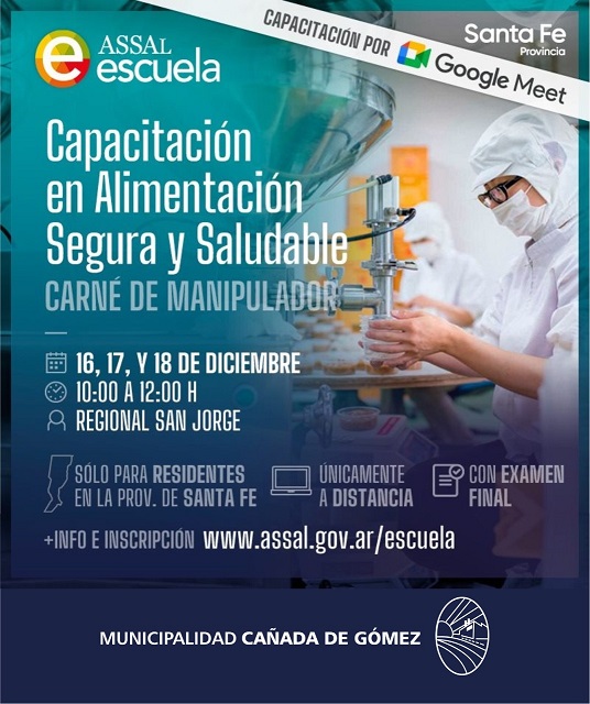 La municipalidad de Cañada de Gómez a través de la Dirección de Bromatología comunica que la Agencia Santafesina de Seguridad Alimentaria (Assal) realizará curso de manipulador de alimentos dirigido a aquellos que produzcan, elaboren, fraccionen, comercialice o transporte alimentos dentro de la Provincia de Santa Fe.