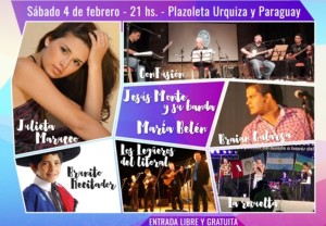 Los artistas que se presentarán en esta oportunidad son: Jesús Monte y su banda, Julieta Marucco, Brunito Recitador, Braian Galarza, ConFusión, María Belén, La Revuelta y Los Legüeros del Litoral. Además habrá stands de micro emprendedores y el buffet estará a cargo de vecinales de la zona sur.