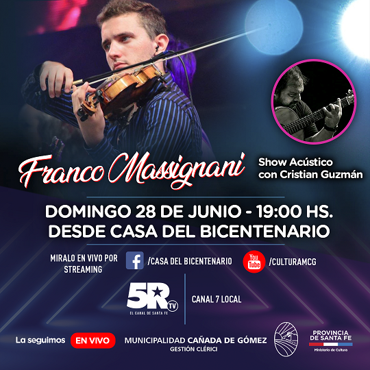 Este domingo 28 de junio desde las 19 hs. estará Franco Massignani, quien hará un show acústico junto a Cristian Guzmán, que podrá seguirse desde el https://www.facebook.com/CasaDelBicentenarioDeCanadaDeGomez/, el canal de YouTube Cultura MCG y por televisión en el canal local (frecuencia 7 de Cablevisión) y el canal provincial 5RTV.