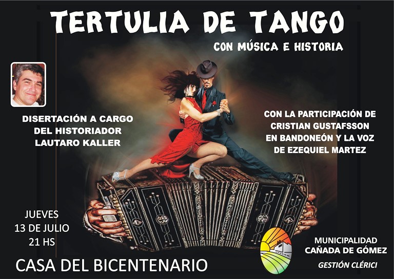 Este jueves 13 de julio a las 21 en Casa del Bicentenario, la Municipalidad de Cañada de Gómez inicia el ciclo de Tertulia de Tango con Música e Historia. Esta vez contamos con la presencia del prestigioso historiador del tango Lautaro Kaller, quién por segunda vez visitará la ciudad. También habrá tiempo para escuchar unos buenos tangos a través de la notable voz de Ezequiel Martez y el exquisito bandoneón del Maestro Cristian Gustafsson, director de la Orquesta Municipal de Tango.Lautaro Kaller es autor del libro “El Tango en Rosario” y según la prensa rosarina «es un investigador riguroso del tango en Rosario… en su libro «El tango en Rosario. Origen y desarrollo de la orquesta típica rosarina», publicado por el sello editorial de la UNR, construye un valioso inventario de los aportes de la Chicago argentina al dos por cuatro, a través de una minuciosa serie de treinta y tres biografías. Los elegidos son nombres relevantes, en muchos casos de músicos que han trascendido con largueza los límites de su espacio natal para proyectarse al país y el mundo: tales los casos del recordado violinista Antonio Agri y los inspirados bandoneonistas Néstor Marconi y Rodolfo «Cholo» Montironi.»