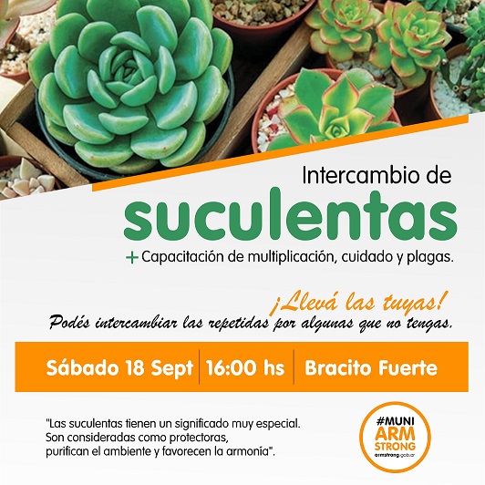 La Municipalidad de Armstrong invita a una nueva propuesta relacionada al intercambio de suculentas más capacitación de multiplicación, cuidado y plagas que se realizará el sábado 18 de septiembre a las 16 hs. en el parque Bracito Fuerte.