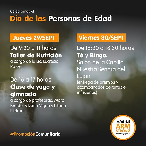 La Secretaría de Promoción Comunitaria de la Municipalidad de Armstrong invita a adultos mayores a participar de encuentros con diferentes temáticas en el marco de la celebración del Día de las Personas de Edad, que se conmemora el 1 de octubre.