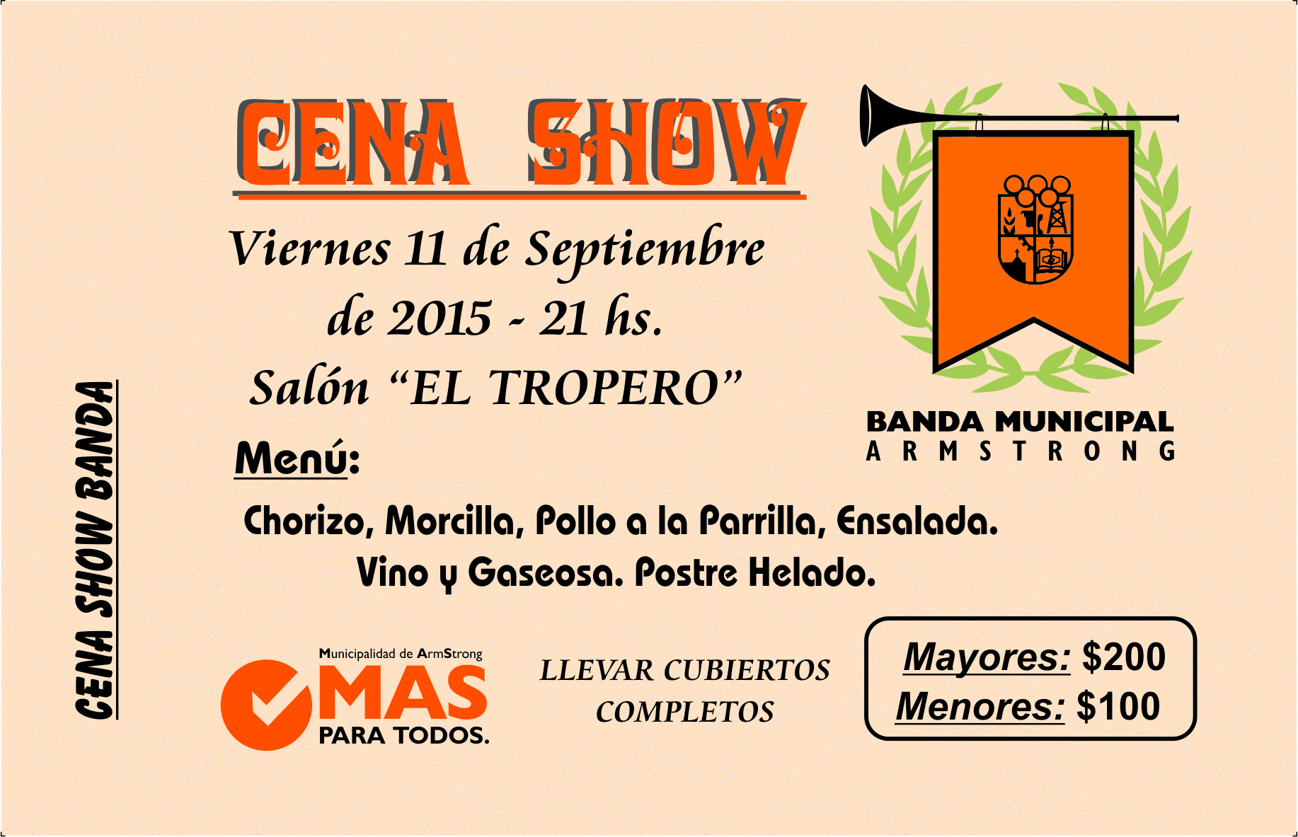 La Municipalidad de Armstrong invita a la cena show de la Banda Municipal que se realizará el viernes 11 de septiembre a partir de las 21 hs. en el salón de “El Tropero”.