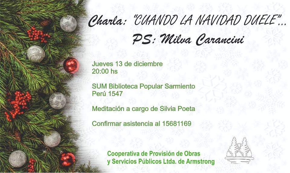 La Cooperativa de Provisión de Obras y Servicios Públicos de Ltda. de Armstrong, invita a la Charla “Cuando la Navidad Duele”, el próximo 13 de diciembre, a las 20hs.