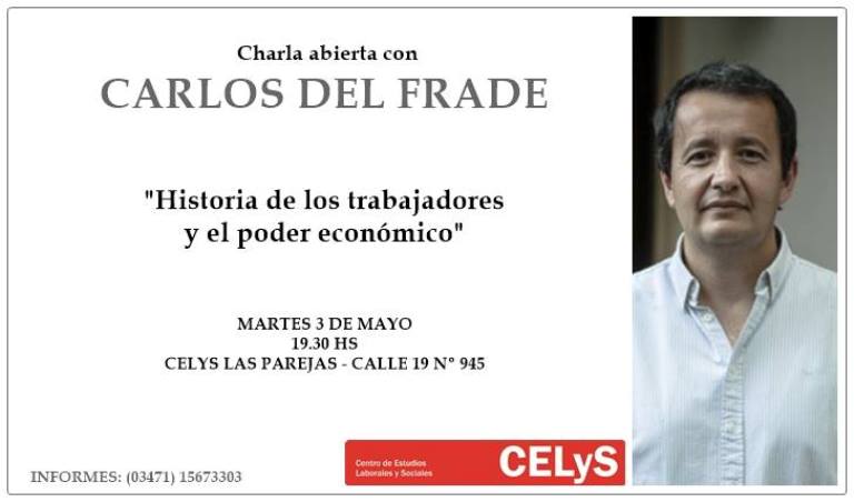 Este martes 3 de mayo desde las 19.30 hs. el Diputado Provincial Carlos Del Frade(Frente Social y Popular) dará una charla abierta a toda la comunidad, en el Celys(Centro de Estudios Laborales y Sociales) de Las Parejas, invitado por su presidente Diputado Miguel Solis. (Partido Socialista).
